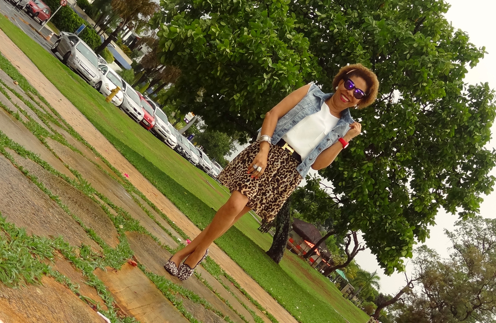 A saia com caimento maravilhoso rouba a cena, coloquei a blusa branca e o colete jeans para a montagem ficar moderninha, slipper de onça, óculos espelhados e bolsa bicolor.